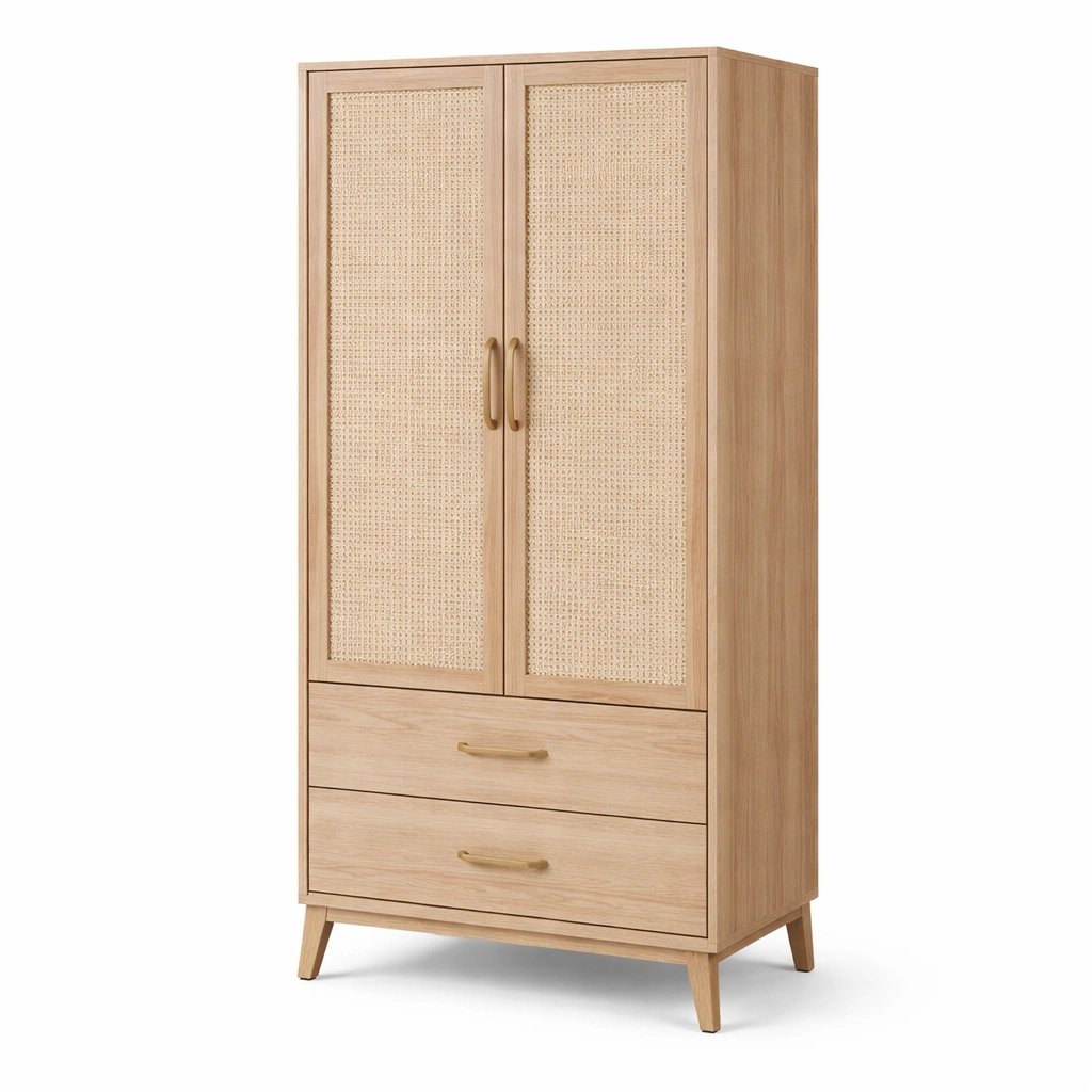 Armario con estructura en madera de roble y puertas de ratán natural. Incluye dos cajones y dos puertas para almacenamiento. Dimensiones: altura 180 cm, ancho 80 cm, profundidad 40 cm. Cuenta con tiradores de aleación de zinc, dos estantes y una barra para colgar ropa.
